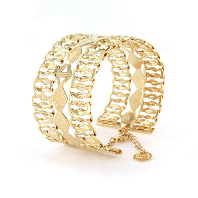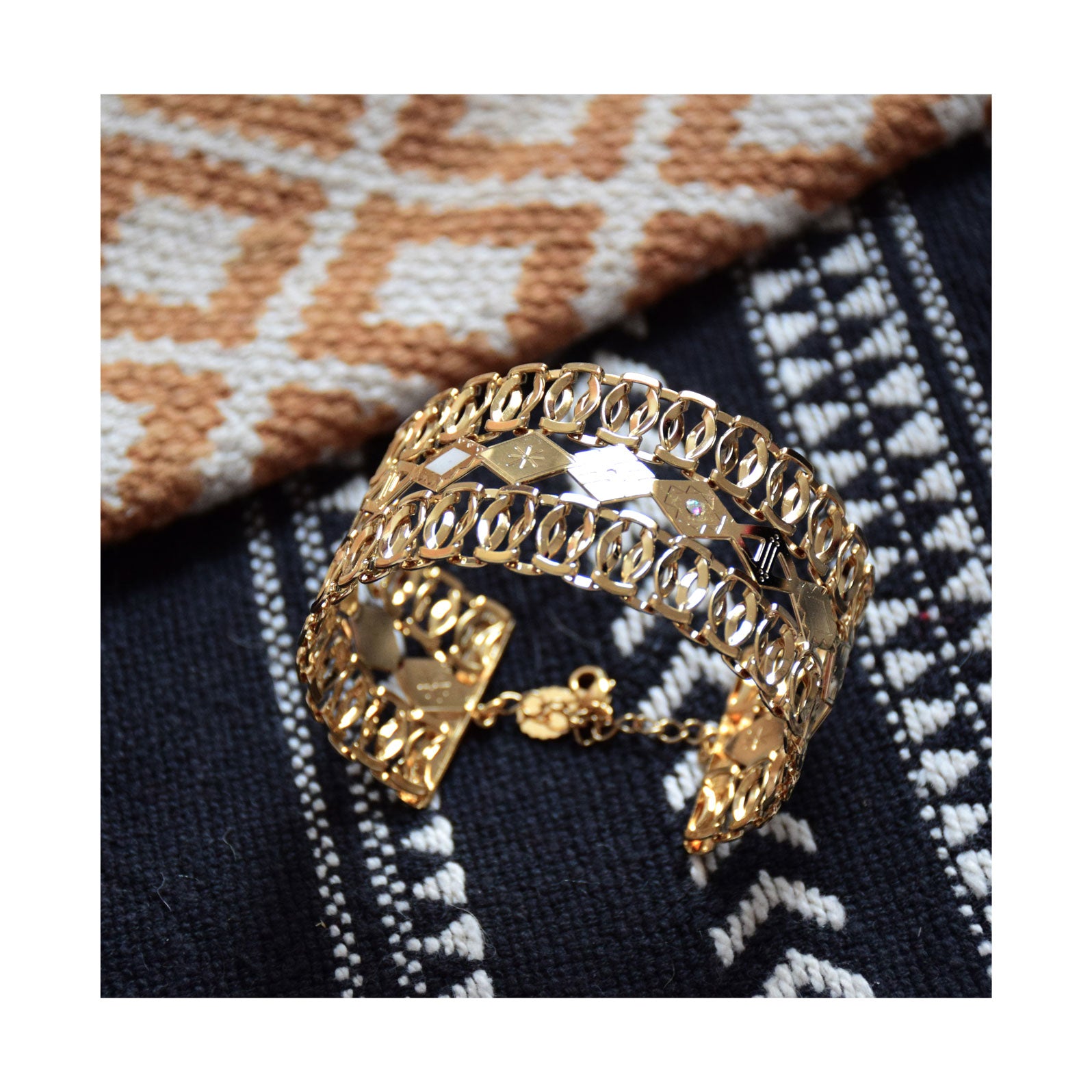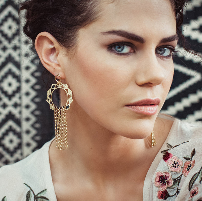 Inspirée des traditions picturales des tribus nomades d’Afrique, cette gamme solaire est riche de symboles tel que le losange pour la féminité et d’autres formes évoquant les étoiles, la Voie lactée, le foyer, la maternité etc. C’est un voyage au cœur des oasis et des dunes de Zagora.